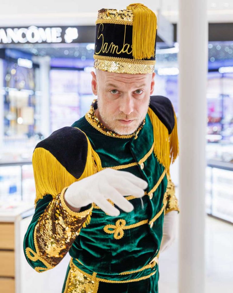 Un artiste charismatique crée l'émerveillement dès l'entrée du public. Il fait scintiller l'ADN de la marque et accueille chaque invité comme un VIP.