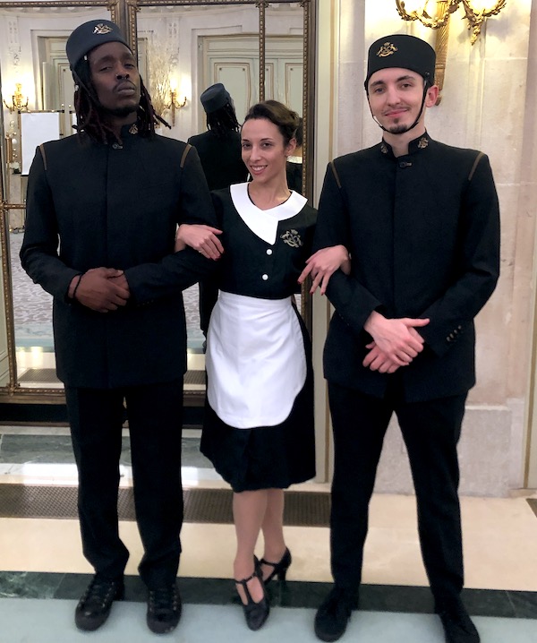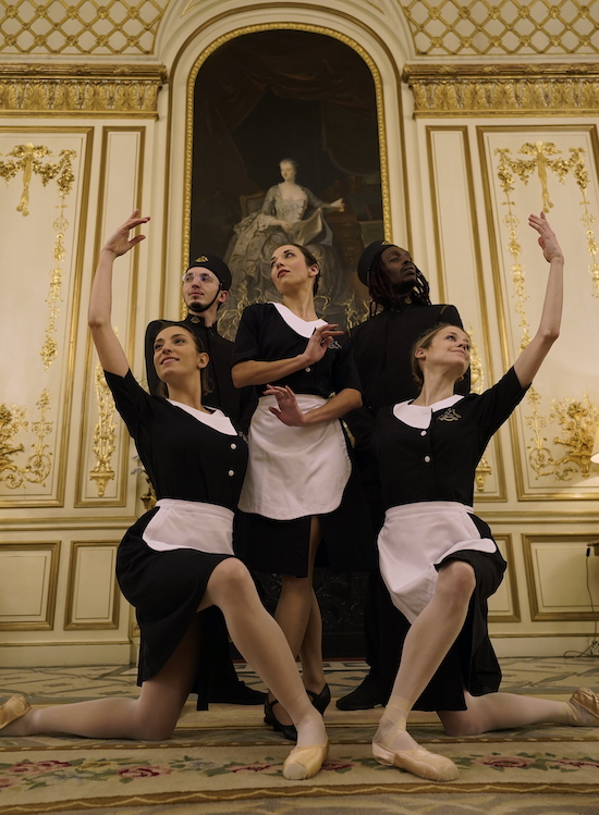 5 danseurs portant les costumes du personnel font irruption dans le lobby puis le restaurant pour présenter plusieurs fois dans la journée une création chorégraphique, adaptée à l’espace.